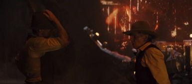 2. 外星人的秘密武器:外星人展示出他们强大的科技力量,发射出一道道激光束,将牛仔逼入绝境。